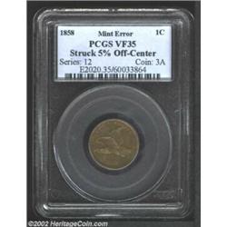 1858 1C Small Letters Cent--Struck 5% Off Center--VF35 PCGS. Extra flan is seen on the lower right p