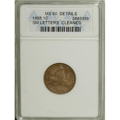 <B>1858 1C Small Letters--Cleaned--ANACS. MS60 Details.</B></I> NGC Census: (4/540). PCGS Population (2/413). Numismedia Wsl. Price: $300. (#2020)<BR><BR><b>Shipping:</b> Coin/Currency (<a target="_blank" href="http://www.heritageauctions.com/common/shipping.php">view shipping information</a>)