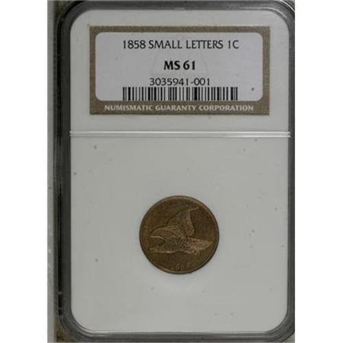 <B>1858 1C Small Letters MS61 NGC.</B></I> NGC Census: (35/535). PCGS Population (9/432). Numismedia Wsl. Price for NGC/PCGS coin in MS61: $352. (#2020)<BR><BR><b>Shipping:</b> Coins & Currency (<a target="_blank" href="http://www.heritageauctions.com/common/shipping.php">view shipping information</a>)
