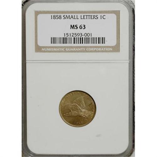 <B>1858 1C Small Letters MS63 NGC.</B></I> Low Leaves, Open E. Violet and emerald tints enliven the mushroom-brown surfaces of this Select survivor. A pleasingly detailed representative of the last Flying Eagle cent issue, one that shows just a few generally inoffensive flaws.<BR><BR><b>Shipping:</b> Coins & Currency (<a target="_blank" href="http://www.heritageauctions.com/common/shipping.php">view shipping information</a>)