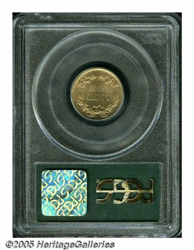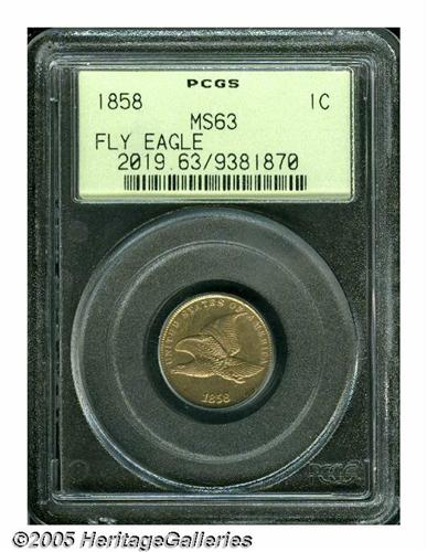 <B>1858<1C> Small Letters MS63 PCGS.</B></I> Warm golden-tan lustrous surfaces exhibit sharply struck design elements, though the eagle's neck displays touches of softness. A few minor contact marks are visible in the lower obverse field, and a few small flecks are scattered over the obverse.