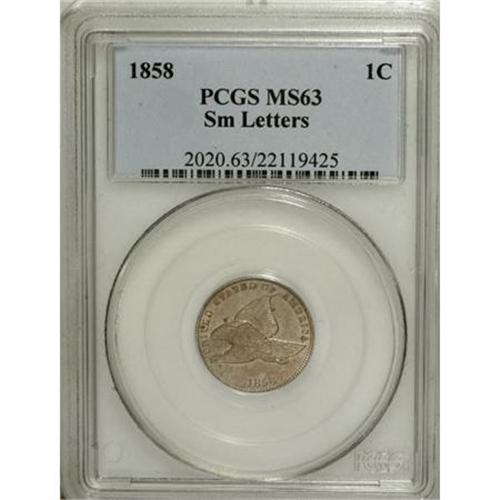 <B>1858 1C Small Letters MS63 PCGS.</B></I> Low Leaves, Open E in ONE. A precisely struck and mildly prooflike rose-tan example. A few subtle gray obverse spots fail to distract.<BR><BR><b>Shipping:</b> Coins & Currency (<a target="_blank" href="http://www.heritageauctions.com/common/shipping.php">view shipping information</a>)