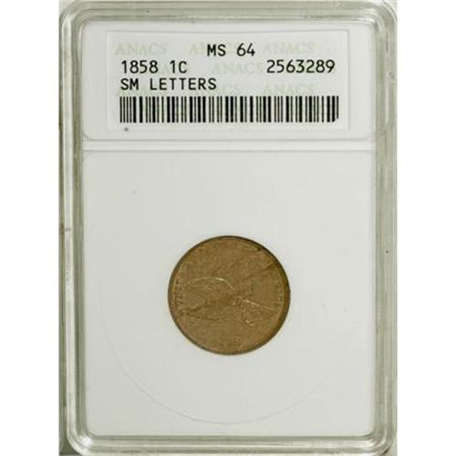 <B>1858 1C Small Letters MS64 ANACS.</B></I> Low Leaves Reverse, Wide Open E. This well struck piece has predominantly mushroom-brown surfaces with hints of orange at the obverse and reverse margins. Minimally marked for the grade with solid visual appeal.<BR><BR><b>Shipping:</b> Coins & Currency (<a target="_blank" href="http://www.heritageauctions.com/common/shipping.php">view shipping information</a>)