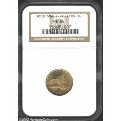1858 1C Small Letters MS64 NGC. Bright luster with a golden tint and an unusually strong strike for this often weak small cent. A couple of shallow marks on each side are mentioned that possibly limit the grade.From the Robert Tarr, Sr. Collection. Important notice: We expect to be auctioning lots at the rate of 200-250 per hour. Sometimes eBay Premier live bid software cannot keep up with that pace, so we strongly recommend that you place a realistic proxy bid now as insurance to avoid disappointment. Also please note that all Heritage/CAA lots purchased through eBay Premier carry a 20% Buyer's Premium. Please make sure you read the Terms and Conditions.