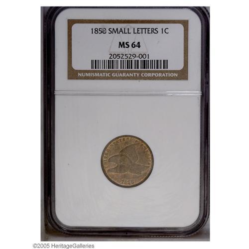 <B>1858<1C> Small Letters MS64 NGC.</B></I> Low Leaves, Closed E in ONE. Variegated lilac-brown toning cedes to glimpses of semi-prooflike surface within protected areas. A nearly unmarked final year near-Gem. The strike is not full on the right edge of the tail, but the devices are generally crisp.
