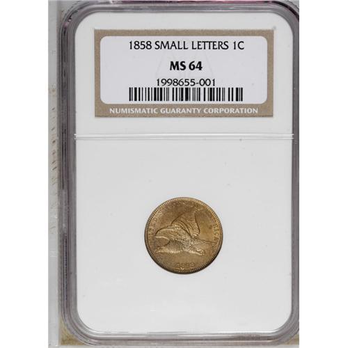 <B>1858<1C> Small Letters MS64 NGC.</B></I> Low Leaves, Open E in ONE. A nicely struck and essentially unabraded near-Gem with attractive olive-gold toning. An interesting and lengthy cud spans the reverse rim between 10:30 and 12:30.