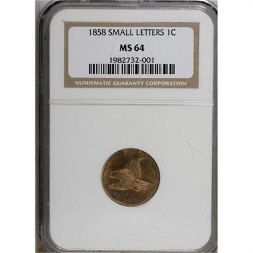 <B>1858 1C Small Letters MS64 NGC.</B></I> Low Leaves, Open E in ONE. An unabraded sun-gold near-Gem. A good strike despite minor softness on the eagle's tail and the right-side cotton leaves. The E in AMERICA is faint due to a strike-through.<BR><BR><b>Shipping:</b> Coins & Currency (<a target="_blank" href="http://www.heritageauctions.com/common/shipping.php">view shipping information</a>)