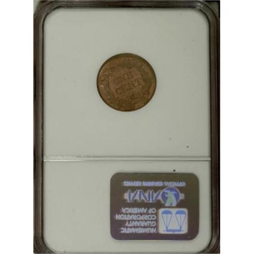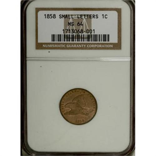 <B>1858 1C Small Letters MS64 NGC.</B></I> Low Leaves Reverse, Open E in ONE. A satiny medium tan-gold near-Gem that has impressively smooth fields and devices. Minute carbon is visible beneath a loupe. The dies are noticeably rotated counter-clockwise, and the back wing is bookended by bold die clashes.<BR><BR><b>Shipping:</b> Coins & Currency (<a target="_blank" href="http://www.heritageauctions.com/common/shipping.php">view shipping information</a>)