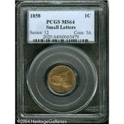 1858 1C Small Letters MS64 PCGS. A nicely struck n <B>1858 1C Small Letters MS64 PCGS.</B></I> A nicely struck near-Gem with slightly prooflike luster and luminous golden-brown color. The S punch (used in STATES) is partially broken at the top. <BR><BR><B>Important notice:</B> Heritage usually auctions material at the rate of 200-250 lots per hour. On some occasions eBay Live bid software or the Internet may not be able to keep up with the pace of the auction. We recommend placing a realistic absentee bid now as insurance to avoid disappointment. Occasionally the auctioneer may eliminate or reject an eBay Live bid, and the auctioneer may also reopen a lot after the close of the eBay live bidding (usually because we missed an audience bid), and may reject your bid even if it shows you as the winning bidder. By bidding via eBay Live, you agree that Heritage may award the lot to another bidder at its sole discretion under the circumstances described above or any other reasonable circumstances. Since eBay bids are not shown to us until we open the lot on the floor, we treat those bids just like floor bids. In most cases the floor responds before the eBay bid is presented to us, due to Internet lag time, so for consistency we have made it a policy that floor bids are always considered first over tie eBay live bids. Also please note that all Heritage lots purchased through eBay Live carry a 20% Buyer's Premium. Please make sure you read the Terms and Conditions before you bid. This lot is being auctioned in conjunction with a live floor auction by Heritage Galleries & Auctioneers. All final auction and invoice information will be supplied by Heritage Galleries & Auctioneers, and all other information should be considered preliminary. Lot:5067