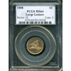 <B>1858 1C Small Letters MS64 PCGS.</B></I> Snow-5, DDR 3-R-III. Misidentified by PCGS as the Large Letters variety. A well struck and lustrous honey-gold near-Gem with splendidly preserved fields. A lintmark through the eagle's claw and planchet flaws on the CE in CENT are of mint origin. The O in ONE is die doubled south. Lot:5185