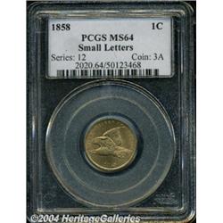 <B>1858<1C> Small Letters MS64 PCGS.</B></I> This golden-brown Flying Eagle Cent has an above average strike and generally impressive preservation. Devoid of carbon and attractive. A short-lived subtype, the Small Letters variety was only produced in 1858. <BR><BR><B>Important notice:</B> Heritage usually auctions material at the rate of 200-250 lots per hour. On some occasions eBay Live bid software or the Internet may not be able to keep up with the pace of the auction. We recommend placing a realistic absentee bid now as insurance to avoid disappointment. Occasionally the auctioneer may eliminate or reject an eBay Live bid, and the auctioneer may also reopen a lot after the close of the eBay live bidding (usually because we missed an audience bid), and may reject your bid even if it shows you as the winning bidder. By bidding via eBay Live, you agree that Heritage may award the lot to another bidder at its sole discretion under the circumstances described above or any other reasonable circumstances. Since eBay bids are not shown to us until we open the lot on the floor, we treat those bids just like floor bids. In most cases the floor responds before the eBay bid is presented to us, due to Internet lag time, so for consistency we have made it a policy that floor bids are always considered first over tie eBay live bids. Also please note that all Heritage lots purchased through eBay Live carry a 20% Buyer's Premium. Please make sure you read the Terms and Conditions before you bid. </span></font></tr></table></td></tr></table>