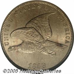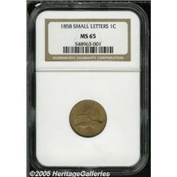 <B>1858 1C Small Letters MS65 NGC.</B></I> Bright luster with a golden tint and an unusually strong strike for this often weak small cent. A couple of small carbon specks on the obverse are noted, that possibly limit the grade. Population: 51 in 65, 12 finer (2/05).