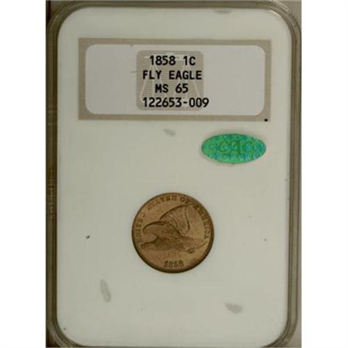 <B>1858 1C Small Letters MS65 NGC. CAC.</B></I> Low Leaves, Open E in ONE. Glossy olive-bronze surfaces and fresh satin luster envelop this uncommonly well struck Flying Eagle cent. A few small carbon spots are noticed here and there in the fields, but only serve to confirm the originally of this nicely preserved type coin.<BR><I>From The Santa Fe Collection, Part Two.</B></I><BR><BR><b>Shipping:</b> Coins & Currency (<a target="_blank" href="http://www.heritageauctions.com/common/shipping.php">view shipping information</a>)