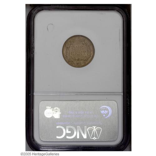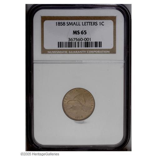 <B>1858<1C> Small Letters MS65 NGC.</B></I> Low Leaves, Closed E in ONE. Light, even chestnut color graces this satiny and pleasing Gem. Crisply struck with no areas of softness on the flying eagle. The reverse is well preserved, and only a couple of faint marks are observed on the obverse field, visible only beneath a lens. This short-lived type is scarce as a Gem. Population: 59 in 65, 13 finer (9/05).
