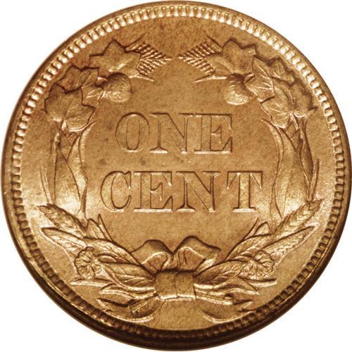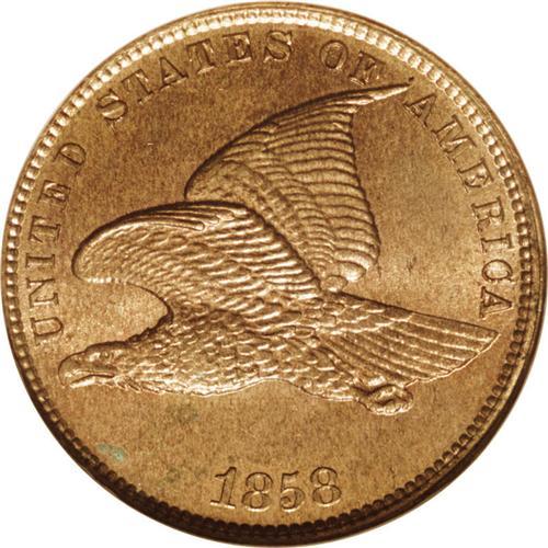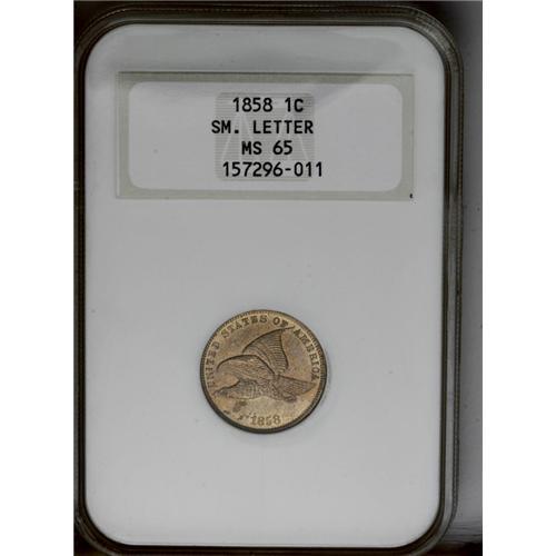 <B>1858<1C> Small Letters MS65 NGC.</B></I> Low Leaves, Open E in ONE. A crisply struck and unabraded chocolate-brown Gem. The luster is vibrant, and only minor aqua specks on the lower left obverse limit the grade. Housed in an older generation holder. Struck from moderately rotated dies.<BR><I>From The Chief Paduke Collection.</B></I>