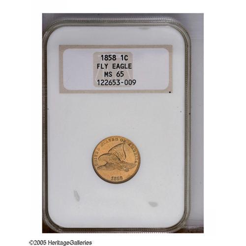 <B>1858<1C> Small Letters MS65 NGC.</B></I> Snow-9. Low Leaves Reverse. A crisply struck and highly lustrous Gem with lovely honey-gold color. Virtually void of contact, although a few minute carbon flecks are present. Light die doubling is seen on the E in ONE, from the use of both Open E and Closed E hubs to create the reverse die. A small cud is noted at 3 o'clock on the reverse. In an early, pre-hologram NGC holder.<BR><I>From The Albert E. Willis Collection.</B></I>