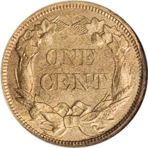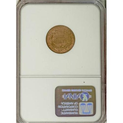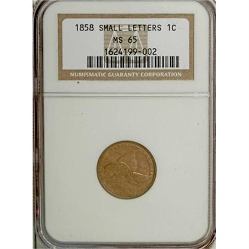 <B>1858 1C Small Letters MS65 NGC.</B></I> Low Leaves, Open E in ONE. This satiny Gem is devoid of abrasions, and the dusky gold surfaces are clearly original. A crisp strike despite a hint of incompleteness on the eagle's head. Interesting obverse peripheral die cracks threaten to form a retained die break across ERICA.<BR><BR><b>Shipping:</b> Coins & Currency (<a target="_blank" href="http://www.heritageauctions.com/common/shipping.php">view shipping information</a>)