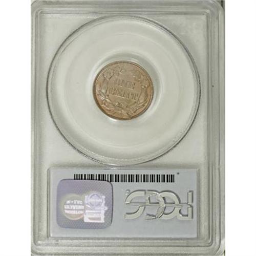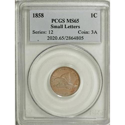 <B>1858 1C Small Letters MS65 PCGS.</B></I> Low Leaves, Closed E in ONE. Although circulated examples are plentiful, the Small Letters variety is rare as a Gem. This is a gorgeous and needle-sharp Flying Eagle cent with unblemished fields and pleasing apricot and walnut-tan toning. A small cud is noted on the reverse at 5 o'clock. Population: 47 in 65, 8 finer (11/07).<BR><BR><b>Shipping:</b> Coins & Currency (<a target="_blank" href="http://www.heritageauctions.com/common/shipping.php">view shipping information</a>)