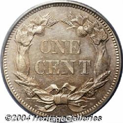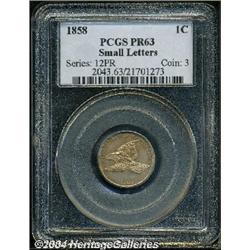 <B>1858<1C> Small Letters PR63 PCGS.</B></I> After they were introduced to the public the smaller sized copper-nickel cents were an immediate commercial success and business strike production quickly vaulted more than 24 million pieces in 1858. Very few proof cents, however, were ordered from the Mint that year and, although no exact mintage figures for proof Flying Eagle cents were kept, it is estimated that approximately 280 pieces of both the Large Letters and Small Letters varieties were struck. Of that meager quantity, the survival rate is very low, as many ultimately entered circulation. This piece shows obvious hairlines, which account for the grade, and each side has light golden-tan coloration with significant reflectivity on the reverse. One of the more affordable examples of this short-lived type in proof format. <BR><BR><B>Important notice:</B> Heritage usually auctions material at the rate of 200-250 lots per hour. On some occasions eBay Live bid software or the Internet may not be able to keep up with the pace of the auction. We recommend placing a realistic absentee bid now as insurance to avoid disappointment. Occasionally the auctioneer may eliminate or reject an eBay Live bid, and the auctioneer may also reopen a lot after the close of the eBay live bidding (usually because we missed an audience bid), and may reject your bid even if it shows you as the winning bidder. By bidding via eBay Live, you agree that Heritage may award the lot to another bidder at its sole discretion under the circumstances described above or any other reasonable circumstances. Since eBay bids are not shown to us until we open the lot on the floor, we treat those bids just like floor bids. In most cases the floor responds before the eBay bid is presented to us, due to Internet lag time, so for consistency we have made it a policy that floor bids are always considered first over tie eBay live bids. Also please note that all Heritage lots purchased through eBay Live carry a 20% Buyer's Premium. Please make sure you read the Terms and Conditions before you bid.