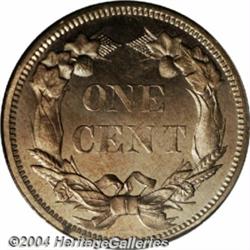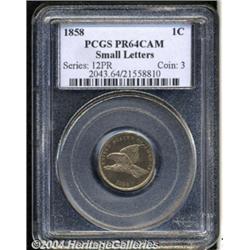 <B>1858<1C> Small Letters PR64 Cameo PCGS.</B></I> Snow-PR2, Snow-PT9. The reverse features the Low Leaves subtype, the ribbon ends do not touch the denticles, and a short die line is found in the denticles beneath the right ribbon end. A well struck near-Gem, the wreath and peripheral details of the eagle are needle-sharp, while only a trace of softness is noted on portions of the letters in ONE CENT. The mirrored fields are flashy, and the light honey-gold surfaces are essentially without contact. A couple of minute carbon flecks are far from the focal points of the coin. Proof Flying Eagle Cents from the final two years of the series, 1857 and 1858, are many times scarcer than those from 1856.<BR><I>From The Harold W. Anderson Collection, Part Two.</B></I> <BR><BR><B>Important notice:</B> Heritage usually auctions material at the rate of 200-250 lots per hour. On some occasions eBay Live bid software or the Internet may not be able to keep up with the pace of the auction. We recommend placing a realistic absentee bid now as insurance to avoid disappointment. Occasionally the auctioneer may eliminate or reject an eBay Live bid, and the auctioneer may also reopen a lot after the close of the eBay live bidding (usually because we missed an audience bid), and may reject your bid even if it shows you as the winning bidder. By bidding via eBay Live, you agree that Heritage may award the lot to another bidder at its sole discretion under the circumstances described above or any other reasonable circumstances. Since eBay bids are not shown to us until we open the lot on the floor, we treat those bids just like floor bids. In most cases the floor responds before the eBay bid is presented to us, due to Internet lag time, so for consistency we have made it a policy that floor bids are always considered first over tie eBay live bids. Also please note that all Heritage lots purchased through eBay Live carry a 20% Buyer's Premium. Please make sure you read the Terms and Conditions before you bid. </span></font></tr></table></td></tr></table>