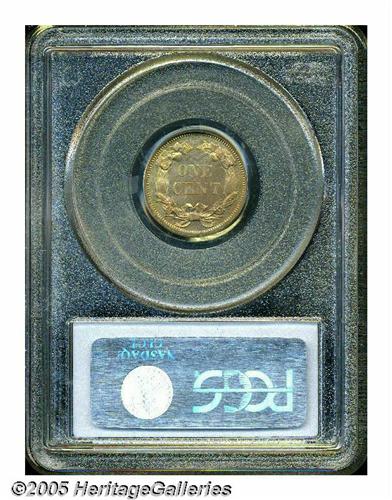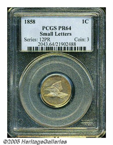 <B>1858<1C> Small Letters PR64 PCGS.</B></I> Snow-PR2, Snow-PT9. The reverse features the Low Leaves subtype, the ribbon ends do not touch the denticles, and a short die line is found in the denticles beneath the right ribbon end. A well struck near-Gem, the wreath and peripheral details of the eagle are needle-sharp, while only a trace of softness is noted on portions of the letters in ONE CENT. The mirrored fields are flashy, and the light honey-gold, green-gold, and reddish surfaces are essentially without contact. A couple of minute planchet voids (as struck) are far from the focal points of the coin. Proof Flying Eagle Cents from the final two years of the series, 1857 and 1858, are many times scarcer than those from 1856. Population: 29 in 64, only 7 finer (3/05).