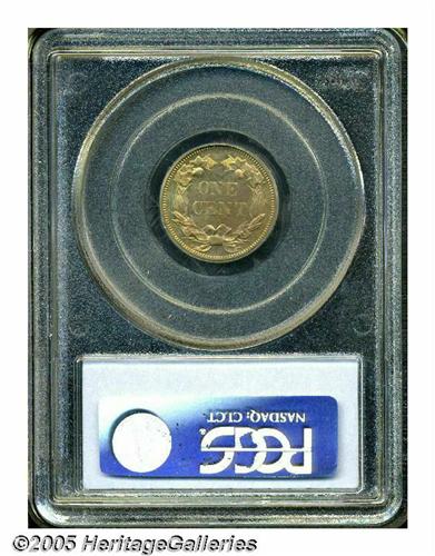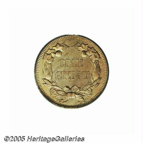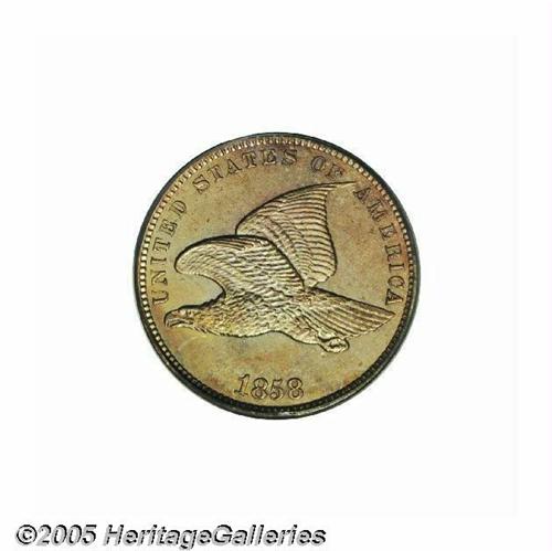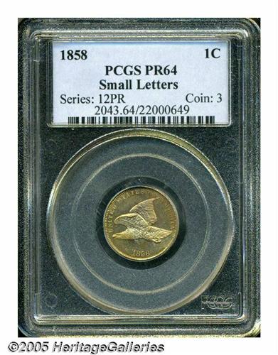 <B>1858<1C> Small Letters PR64 PCGS.</B></I> Snow-PR2, Snow-PT9. The reverse features the Low Leaves subtype, the ribbon ends do not touch the denticles, and a short die line is found in the denticles beneath the right ribbon end. A well struck near-Gem, the wreath and peripheral details of the eagle are needle-sharp, while only a trace of softness is noted on portions of the letters in ONE CENT. The mirrored fields are flashy, and the light honey-gold, green-gold, and reddish surfaces are essentially without contact. A couple of minute planchet voids are far from the focal points of the coin. Proof Flying Eagle Cents from the final two years of the series, 1857 and 1858, are many times scarcer than those from 1856. Population: 29 in 64, 7 finer (6/05).