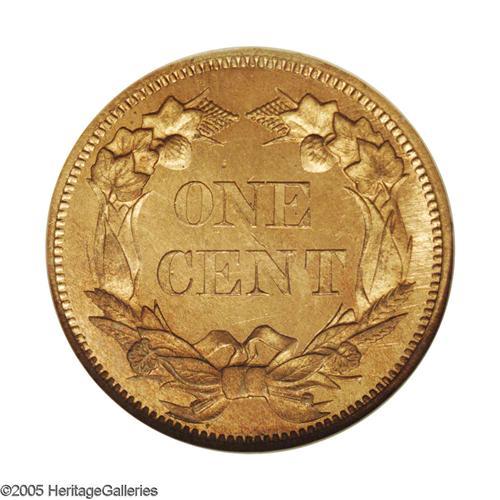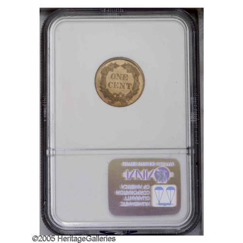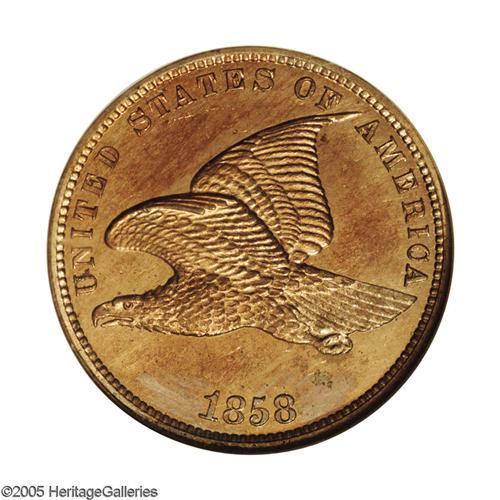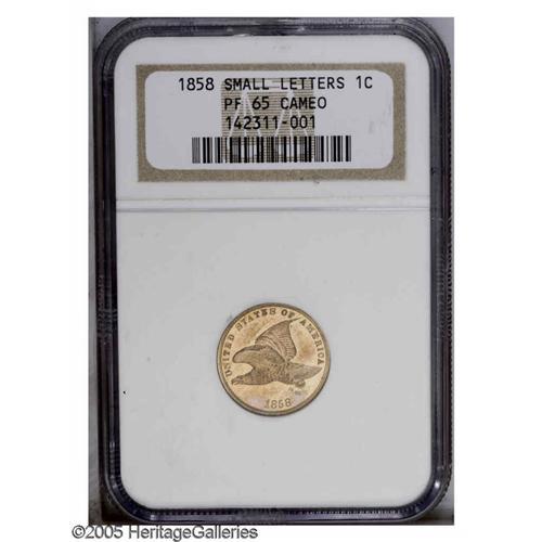 <B>1858<1C> Small Letters PR65 Cameo NGC.</B></I> High Leaves Reverse. Snow-PR1. A heavily striated golden-tan specimen with fully defined features and noticeably greater contrast than is normally exhibited on this elusive proof striking. A glancing blemish is detected under TAT of STATES and another paper-thin mark is situated between the two Ns on the reverse. These aside, the coin is remarkably preserved and extremely flashy. The ultimate representative of either variant of the 1858 Cent must surely be one of the rare proofs. We do not know exactly how many specimen strikings of the Small Letters version were originally prepared by the Philadelphia Mint, but current numismatic wisdom points to an estimate of 100 pieces, of which perhaps 75 pieces survive today, which is approximately the same number of proof 1857s extant. It should be noted that proof Flying Eagle Cents from both 1857 and 1858 are considerably more difficult to locate than their more widely publicized brethren dated 1856. Census: 1 in 65 Cameo, 0 finer (11/05).