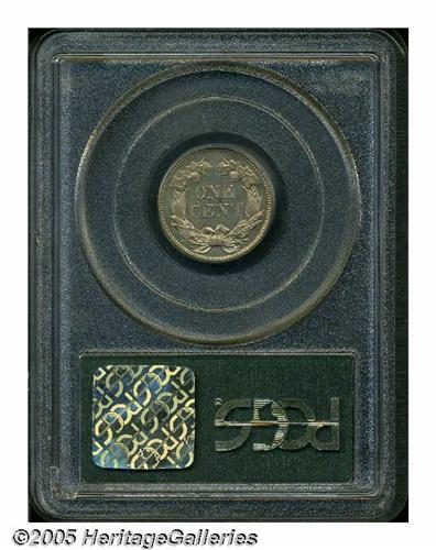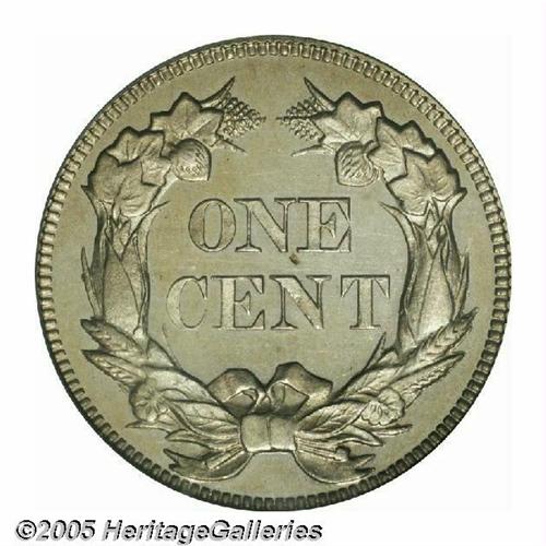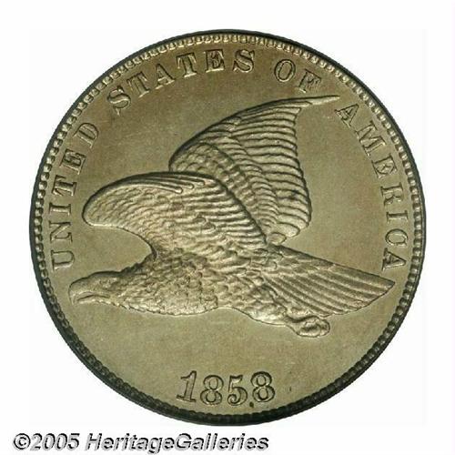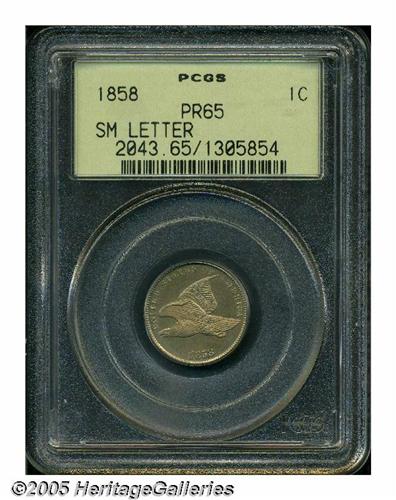 <B>1858<1C> Small Letters PR65 PCGS.</B></I> Perhaps 100 to 200 Small Letters proof cents were coined and distributed, apparently with 12-coin sets of copper-nickel cent patterns. Among proof Flying Eagle cents, this issue is the most often seen, however, still deserves the title "rare." It is generally believed that the dies, or at least the obverse die, were engraved by Anthony Paquet, using his letter font intended for dimes. Many of the letters have the slightly more delicate appearance usually associated with Paquet's work. The Gem offered here is a light tan beauty with sharp design features. The obverse has a slightly more golden appearance than the reverse. A few spots and splashes of toning are noted, although these are very slight. The present sale offers an important opportunity to acquire a set of proof Flying Eagle cents, all in Gem quality. Population: 6 in 65, 1 finer (4/05).
