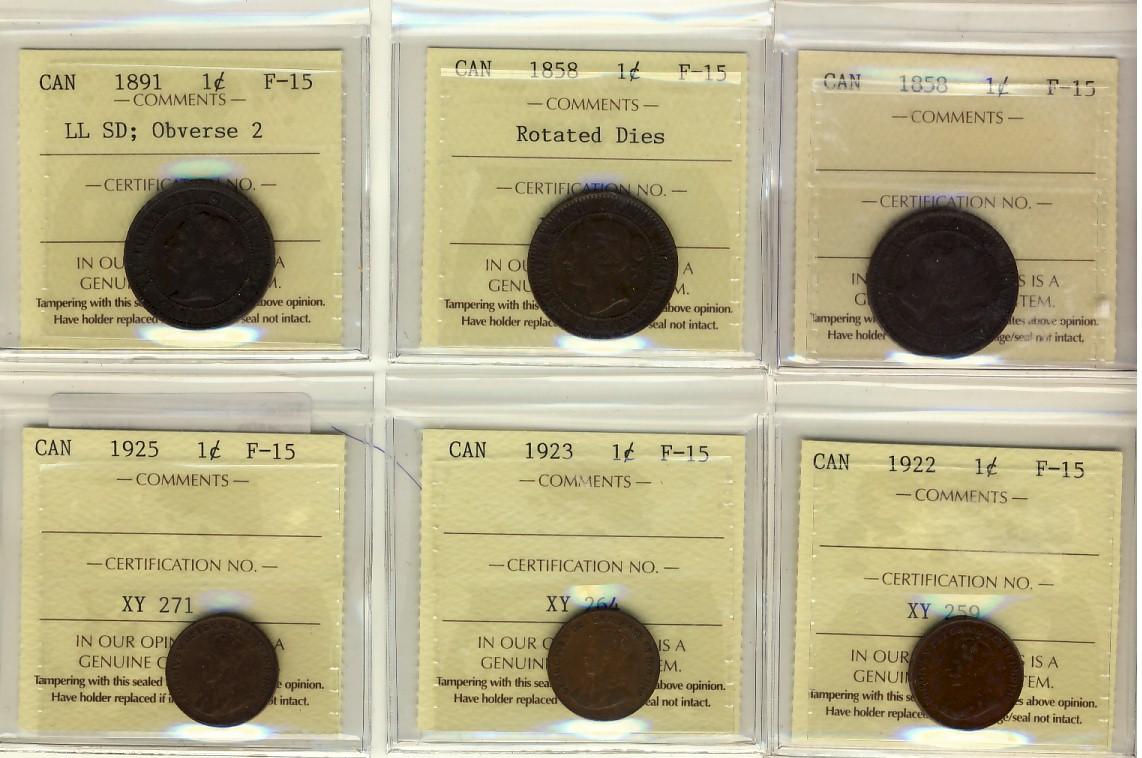 1858(2) 1¢, 1891 LL SD Ibv 2, 1922, 1923 & 1925 ICCS F15. Lot of 6 coins.