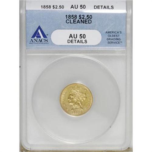 <B>1858 $2 1/2 --Cleaned--ANACS AU50 Details.</B></I> NGC Census: (6/151). PCGS Population (12/74). Mintage: 47,377. Numismedia Wsl. Price for NGC/PCGS coin in AU50: $279. (#7786)<BR><BR><B>Coin Engraver:</B> Christian Gobrecht<BR><BR><b>Shipping:</b> Coins & Currency (<a target="_blank" href="http://www.heritageauctions.com/common/shipping.php">view shipping information</a>)