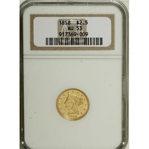 <B>1858 $2 1/2 AU53 NGC.</B></I> NGC Census: (8/135). PCGS Population (6/69). Mintage: 47,377. Numismedia Wsl. Price for NGC/PCGS coin in AU53: $320. (#7786)<BR><BR><b>Shipping:</b> Coins & Currency (<a target="_blank" href="http://www.heritageauctions.com/common/shipping.php">view shipping information</a>)