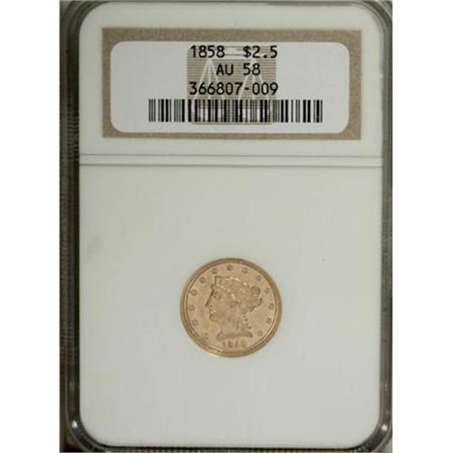 <B>1858 $2 1/2 AU58 NGC.</B></I> NGC Census: (64/61). PCGS Population (19/36). Mintage: 47,377. Numismedia Wsl. Price for NGC/PCGS coin in AU58: $440. (#7786)<BR><BR><B>Coin Engraver:</B> Christian Gobrecht<BR><BR><b>Shipping:</b> Coins & Currency (<a target="_blank" href="http://www.heritageauctions.com/common/shipping.php">view shipping information</a>)