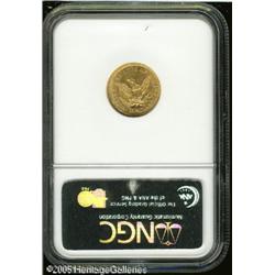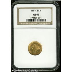 <B>1858 $2 1/2 MS62 NGC.</B></I> Sharply struck except for the eagle's neck and leg feathers and the hair curl below Liberty's ear. The moderately abraded surfaces have extensive satiny luster. One mark is mentioned in the left obverse field near Liberty's nose. Only 47,477 pieces were issued, not many of which have survived in Uncirculated grades.<BR><I>From The Richard J. Chouinard Collection of United States Coins, Part Two.</B></I> Lot:7592