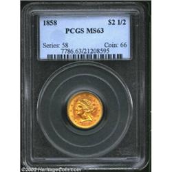 1858 $2 1/2 MS63 PCGS. A low mintage P-mint Quarter Eagle from the 1850s, the 1858 was produced to t
