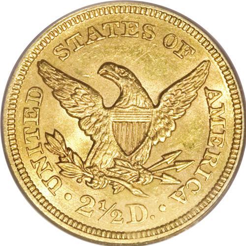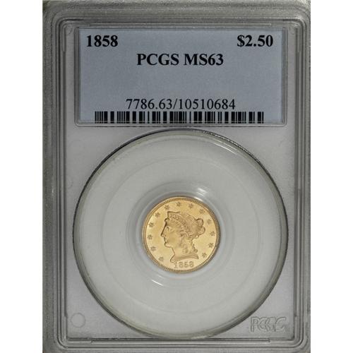 <B>1858 $2 1/2 MS63 PCGS.</B></I> A sharply struck piece with satiny surfaces and lovely yellow-gold luster. The Philadelphia Mint produced large quantities of gold during the first few years of the decade, a result of the increased supply of gold from California. By 1858, that source had diminished considerably, and production was back to the levels of earlier years, such as the mintage of 47,377 pieces for this issue. Population: 10 in 63, 6 finer (1/07).<BR><BR><b>Shipping:</b> Coins & Currency (<a target="_blank" href="http://www.heritageauctions.com/common/shipping.php">view shipping information</a>)