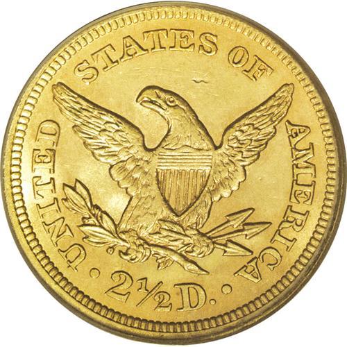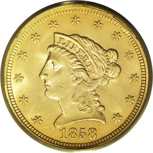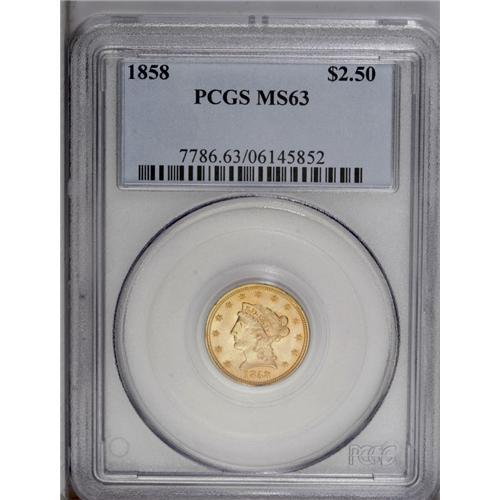 <B>1858<$2 1/2> MS63 PCGS.</B></I> While not an especially scarce coin, the 1858 is significant in Uncirculated grades because so few early (pre-1880) quarter eagles were saved in mint condition. This is a highly lustrous coin with thick mint frost over each side. A bit softly struck in the centers, there are a few small marks in the center of the obverse that explain the MS63 grade. Exceptionally attractive color is seen throughout with significant portions of lilac interspersed with deep reddish-golden. Population: 12 in 63, 6 finer (7/06).