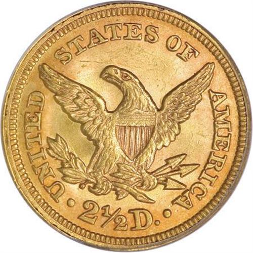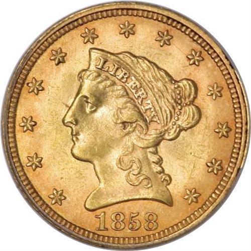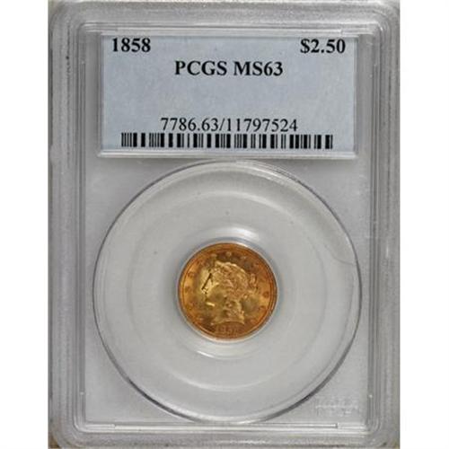 <B>1858 $2 1/2 MS63 PCGS.</B></I> Mint State 1858 quarter eagles are scarce at all levels of preservation. Indeed, PCGS and NGC have graded fewer than 100 Uncirculated examples. Attractive variegated yellow and reddish-gold patina covers both faces of this Select example, complementing lustrous surfaces that exhibit well impressed design elements, save for minor softness in the eagle's leg feathers. A handful of minute marks define the grade.<BR><BR><B>Coin Engraver:</B> Christian Gobrecht<BR><BR><b>Shipping:</b> Coins & Currency (<a target="_blank" href="http://www.heritageauctions.com/common/shipping.php">view shipping information</a>)