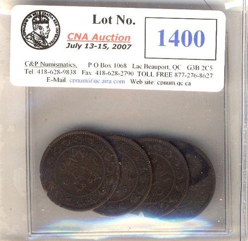 1858 (2), 1859 8/9 (2) 1¢, lot of 4 pieces. Grades vary from G4 to F12. All with problems.