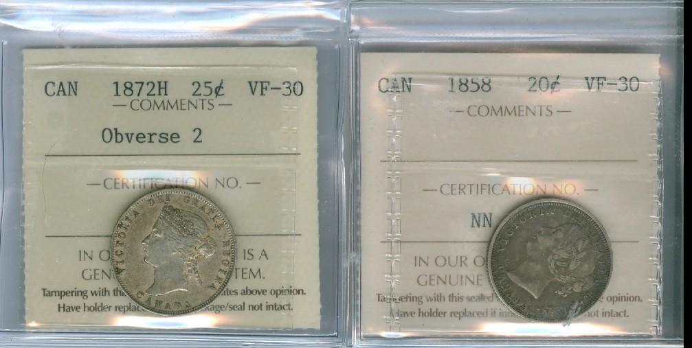 1858 20¢ & 1872H 25¢. Lot of two ICCS VF30 coins.