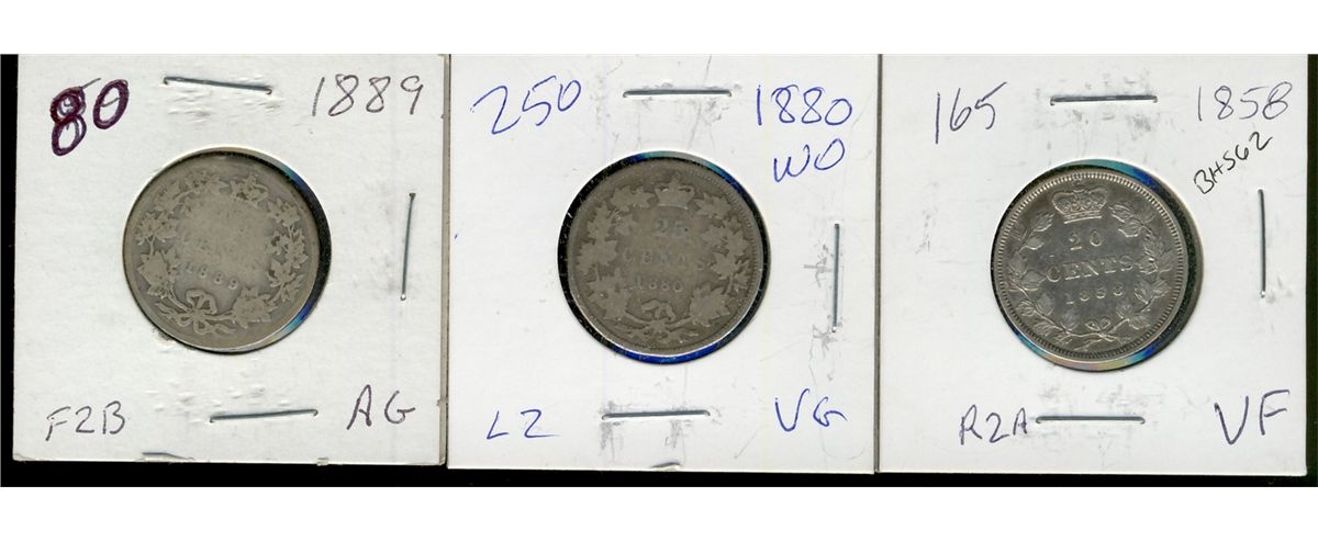 1858 20¢, 1880 25¢ W0 & 1889. Nice lot of 3 coins Good to Fine
