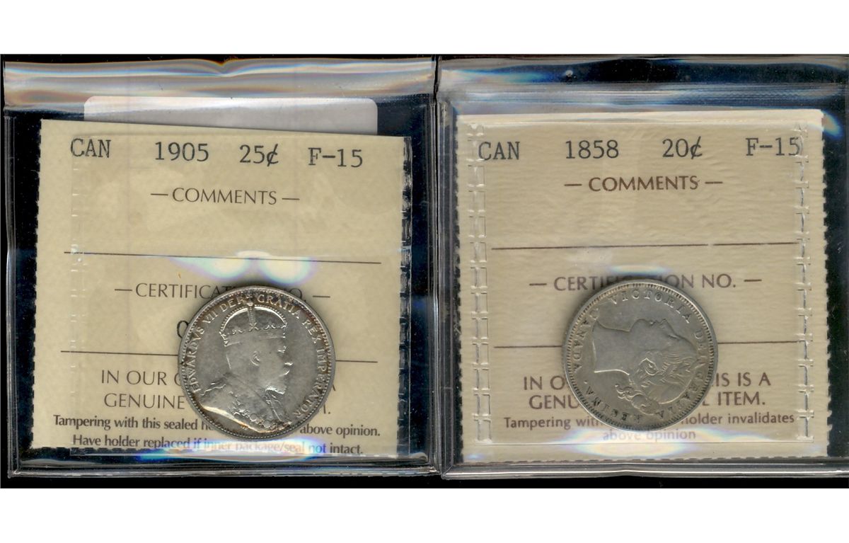 1858 20¢ & 1905 25¢ ICCS F15. Lot of 2 coins.
