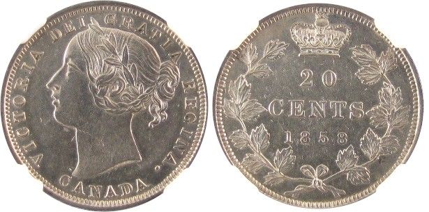 1858 20¢ 20¢ NGC AU55. Well struck with lots of lustre.