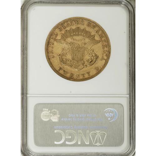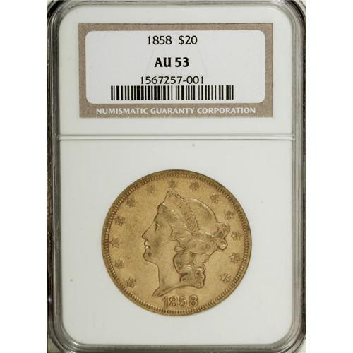 <B>1858 $20 AU53 NGC.</B></I> Red-gold surfaces exhibit traces of luster in the recessed areas of this AU53 double eagle, and well defined design features are noted on both sides. The few minute marks scattered about are inoffensive.<BR><BR><b>Shipping:</b> Coins & Currency (<a target="_blank" href="http://www.heritageauctions.com/common/shipping.php">view shipping information</a>)
