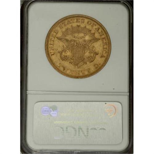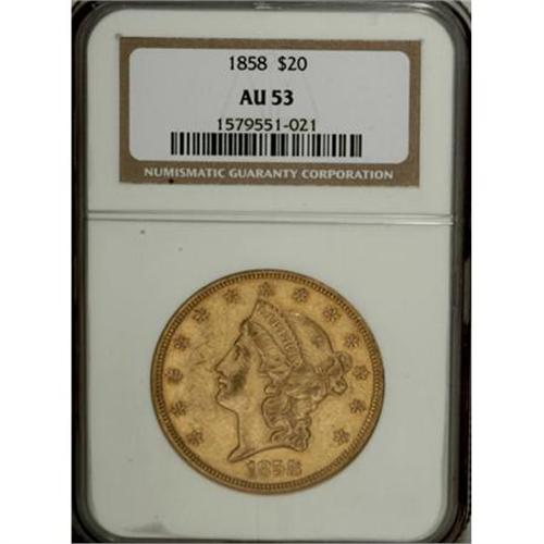 <B>1858 $20 AU53 NGC.</B></I> A still-lustrous orange-gold example of this Philadelphia issue, slightly dusky overall with light, scattered abrasions over modestly worn devices. Attractive for the grade.<BR><BR><B>Coin Engraver:</B> James B. Longacre<BR><BR><b>Shipping:</b> Coins & Currency (<a target="_blank" href="http://www.heritageauctions.com/common/shipping.php">view shipping information</a>)