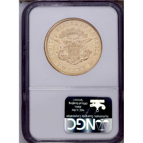 <B>1858<$20> AU55 NGC.</B></I> Bright peach-gold surfaces reveal considerable residual luster in the protected areas, and a few minute contact marks over each side, along with wispy slide marks on the obverse. The design elements display nice detail, though Liberty's hair curls are a touch soft.