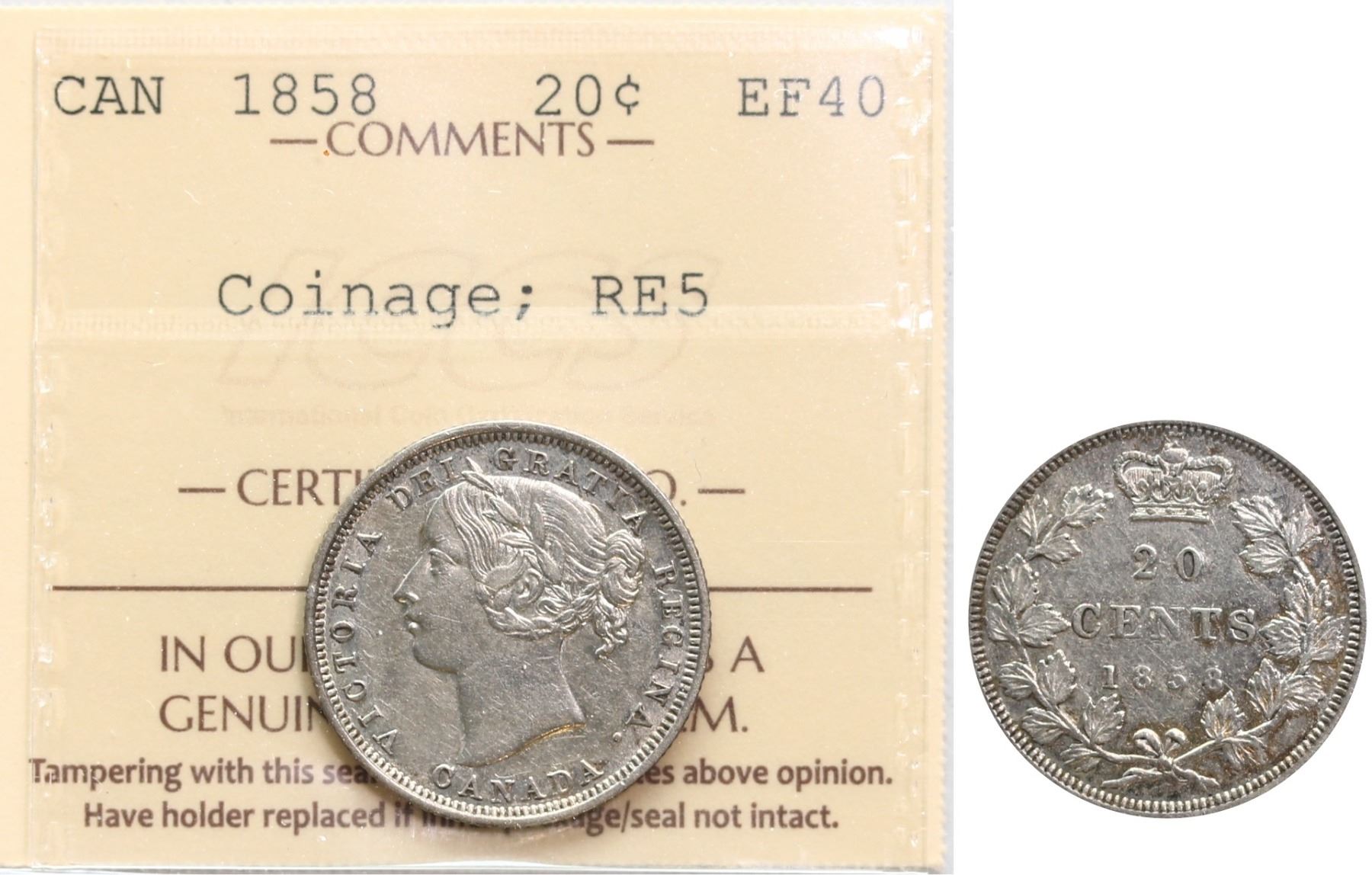 1858 20¢ "Coinage; RE-ENG/5 ICCS Extra Fine-40. Brilliant and lustrous.