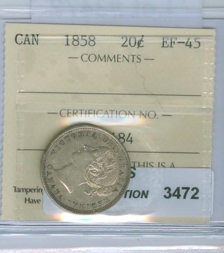 1858 20¢ ICCS EF-45. Good strike. Light to medium toning.