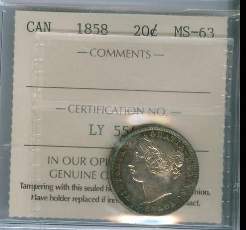1858 20¢ ICCS MS63. Well struck with nice rim tone on both obv and rev.