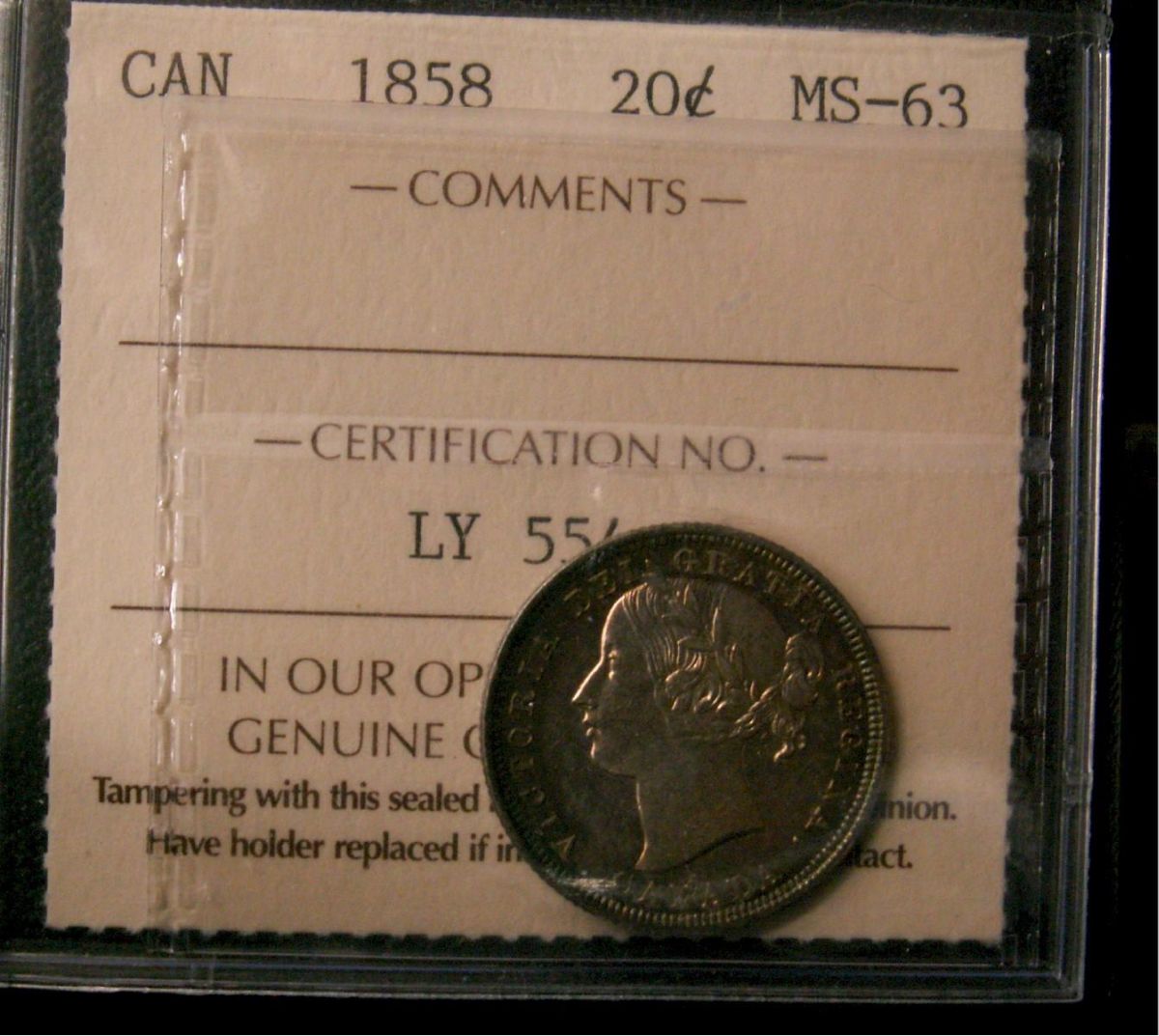 1858 20¢ ICCS MS63. Well struck with nice rim tone on both obv and rev.