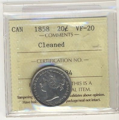 1858 20¢ ICCS VF20 Cleaned.